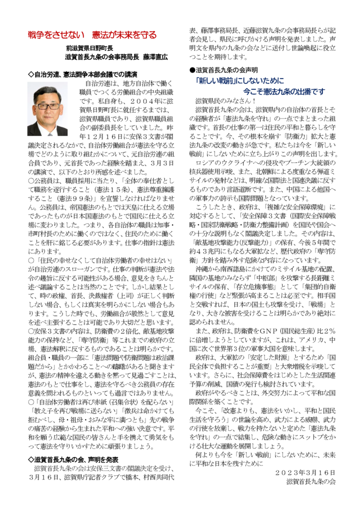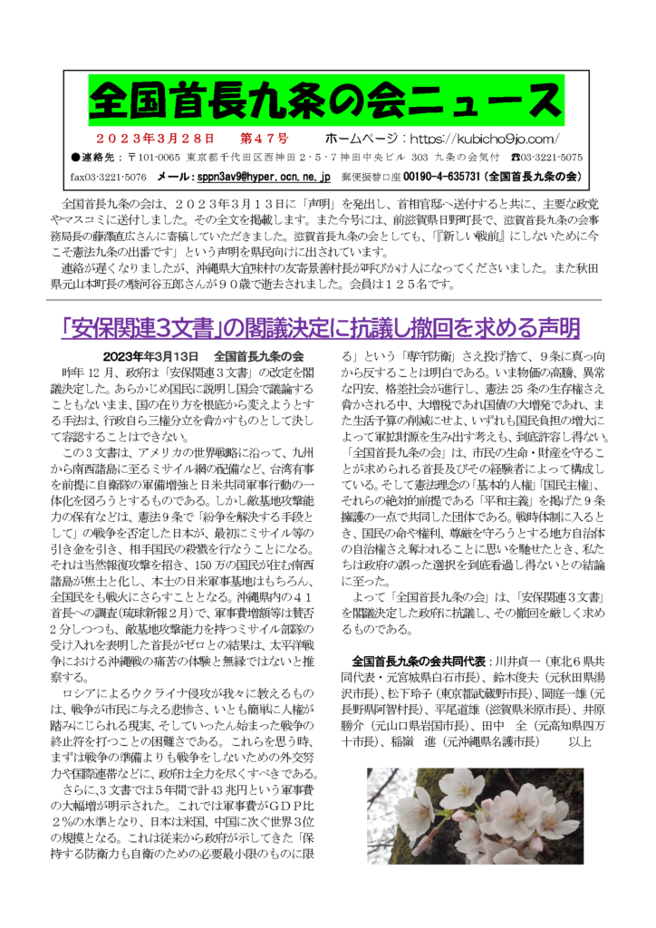 全国首長九条の会ニュース 第47号 2023年4月1日 最終更新日時 : 2023年4月1日 kubi9 【主な記事】 「安保関連3文書」の閣議決定に抗議し撤回を求める声明 戦争をさせない 憲法が未来を守るー藤澤直広 滋賀首長九条の会の声明 PDFファイルでご覧ください。 クリック→【PDF】