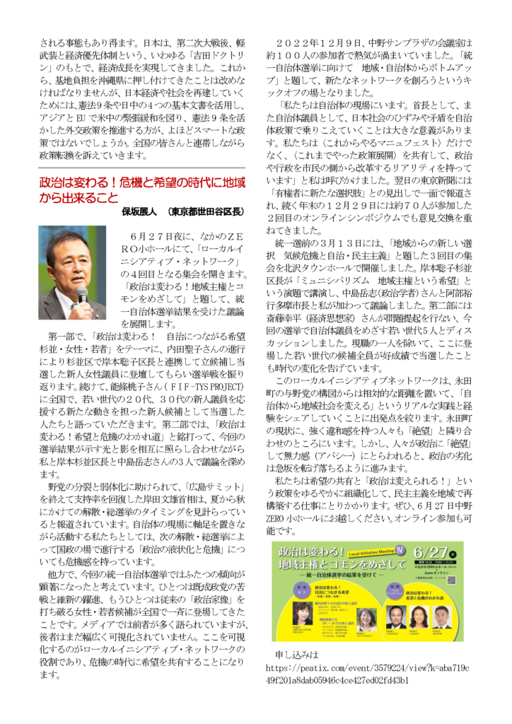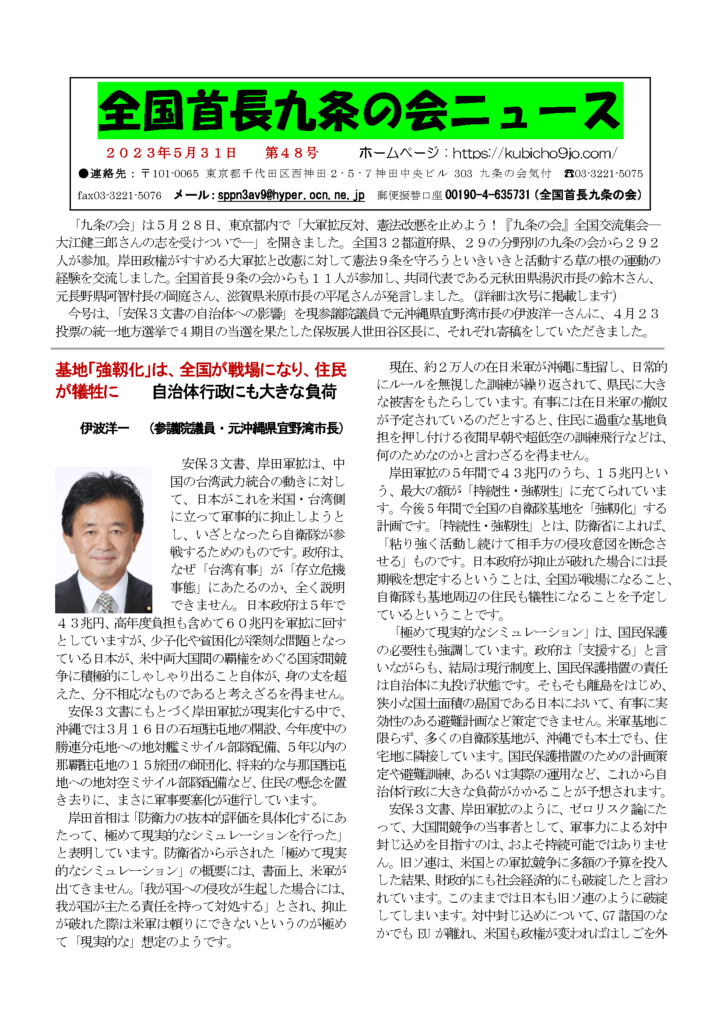 全国首長九条の会ニュース 第48号 2023年6月2日 最終更新日時 : 2023年6月2日 kubi9 【主な記事】 基地「強靱化」は、 全国が戦場にな り、 住民が 犠牲 に 自治体行政にも大きな負荷 伊波洋一 参議院 議員 ・ 元 沖縄県 宜野湾 市長 政治は 変わる 危機と 希望の 時代に 地域から 出来ること 保坂 展人 東京都 世田谷区長 PDFファイルでご覧ください。 クリック→【PDF】