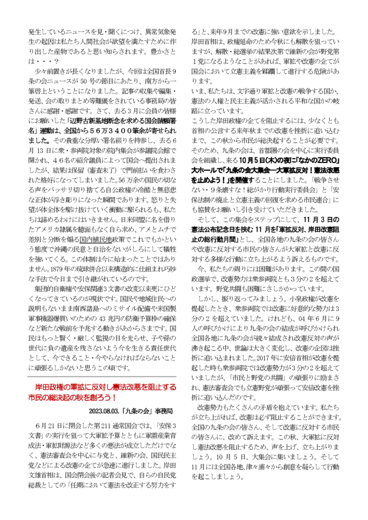 全国首長九条の会ニュース 第50号 2023年8月16日 最終更新日時 : 2024年1月22日 kubi9 【主な記事】 【特別寄稿】長崎市長 鈴木史朗 【特別寄稿】共同代表・元沖縄県名護市長 稲嶺進 岸田政権の軍拡に反対し憲法改悪を阻止する市民の総決起の秋を創ろう! PDFファイルでご覧ください。 クリック→【PDF】