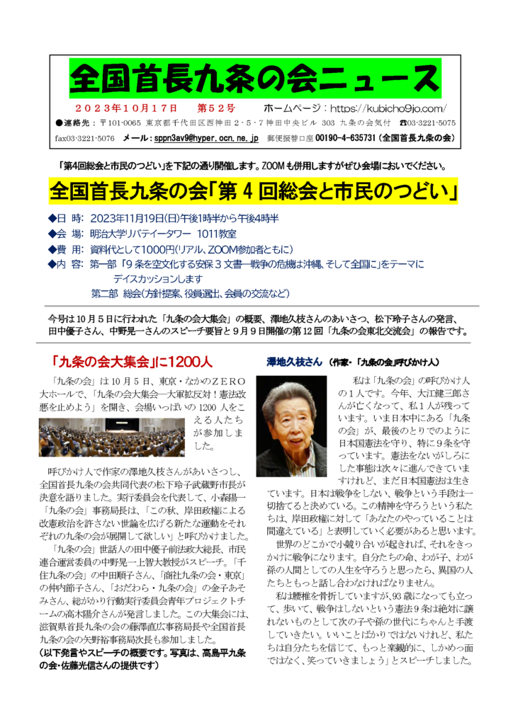 全国首長九条の会ニュース 第52号 2023年10月21日 最終更新日時 : 2024年1月22日 kubi9 【主な記事】九条の会大集会に1200人 PDFファイルでご覧ください。 クリック→【PDF】