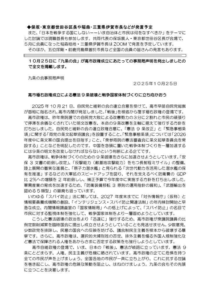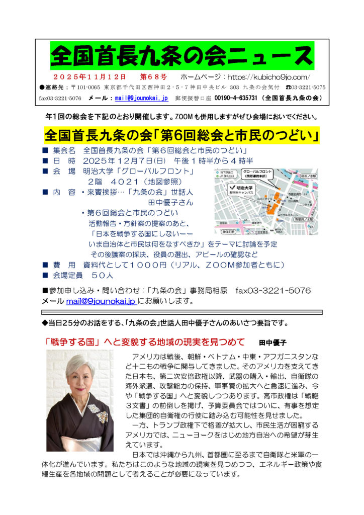 「全国首長九条の会第6回総会と市民のつどい」開催のご案内